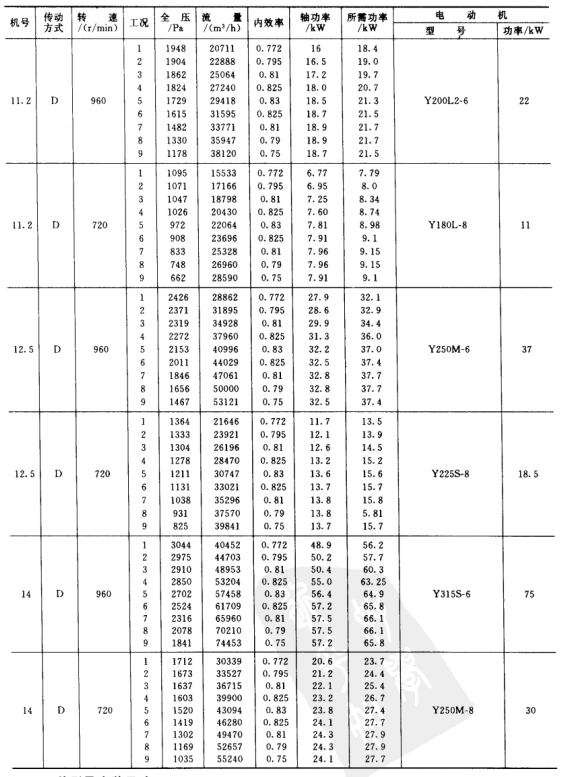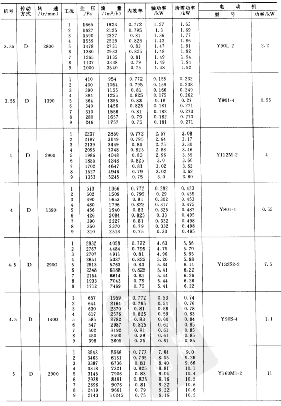 1)本風(fēng)機(jī)為單吸入風(fēng)機(jī),機(jī)號有No.3.15、3.55、4、4.5、5、5.6、6.3、7.1、8、9、10、11.2、12.5、14等共14個機(jī)號組成。