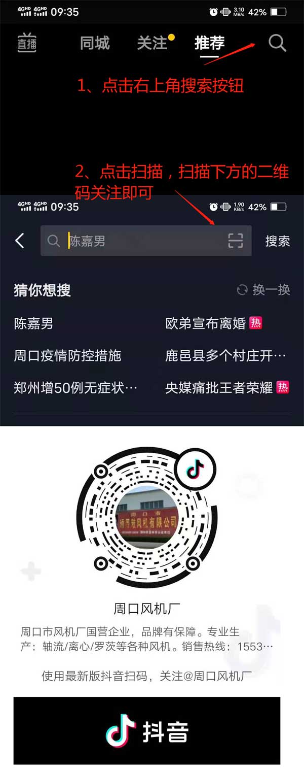 方法二:打開抖音APP,在右上角搜索欄輸入:周口風機廠,或者輸入抖音號:97903992377。